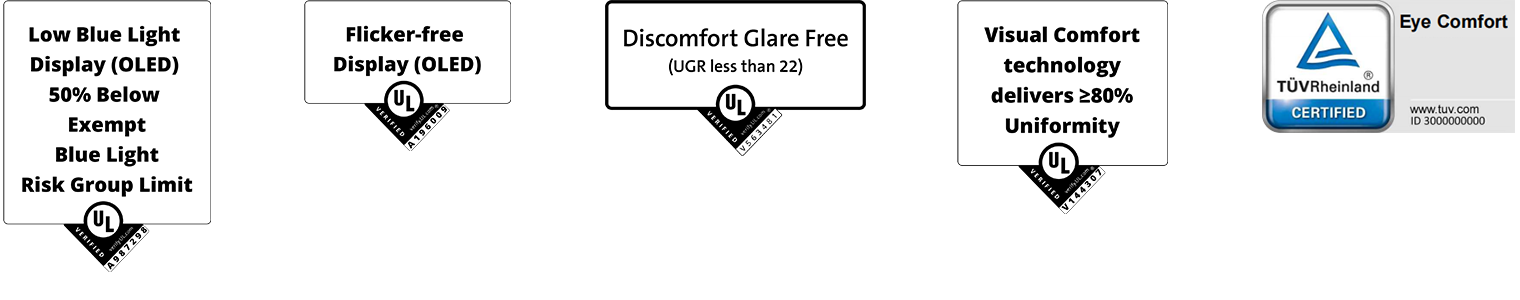 *Panourile OLED au fost certificate ca lumină albastră scăzută, fără pâlpâire, fără disconfort, confortul vizual, prin uniformitate ridicată și negru prefect de laboratoarele de subscrii (UL).